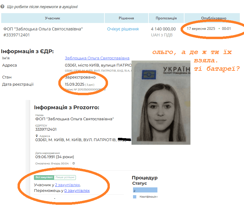 А, до речі. Ще Ольга виграла торги на батареї у військової частини А2077. І теж – 17 вересня.