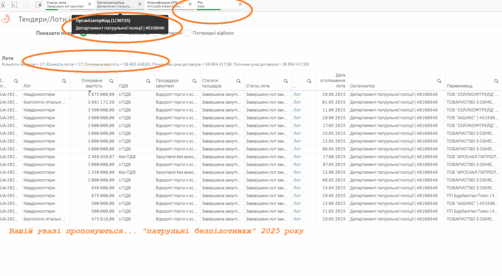 А безпілотники у них є. Наприклад, у 2025 році Патрульні провели 17 закупівель на БПЛА на понад 38 мільйонів гривень.