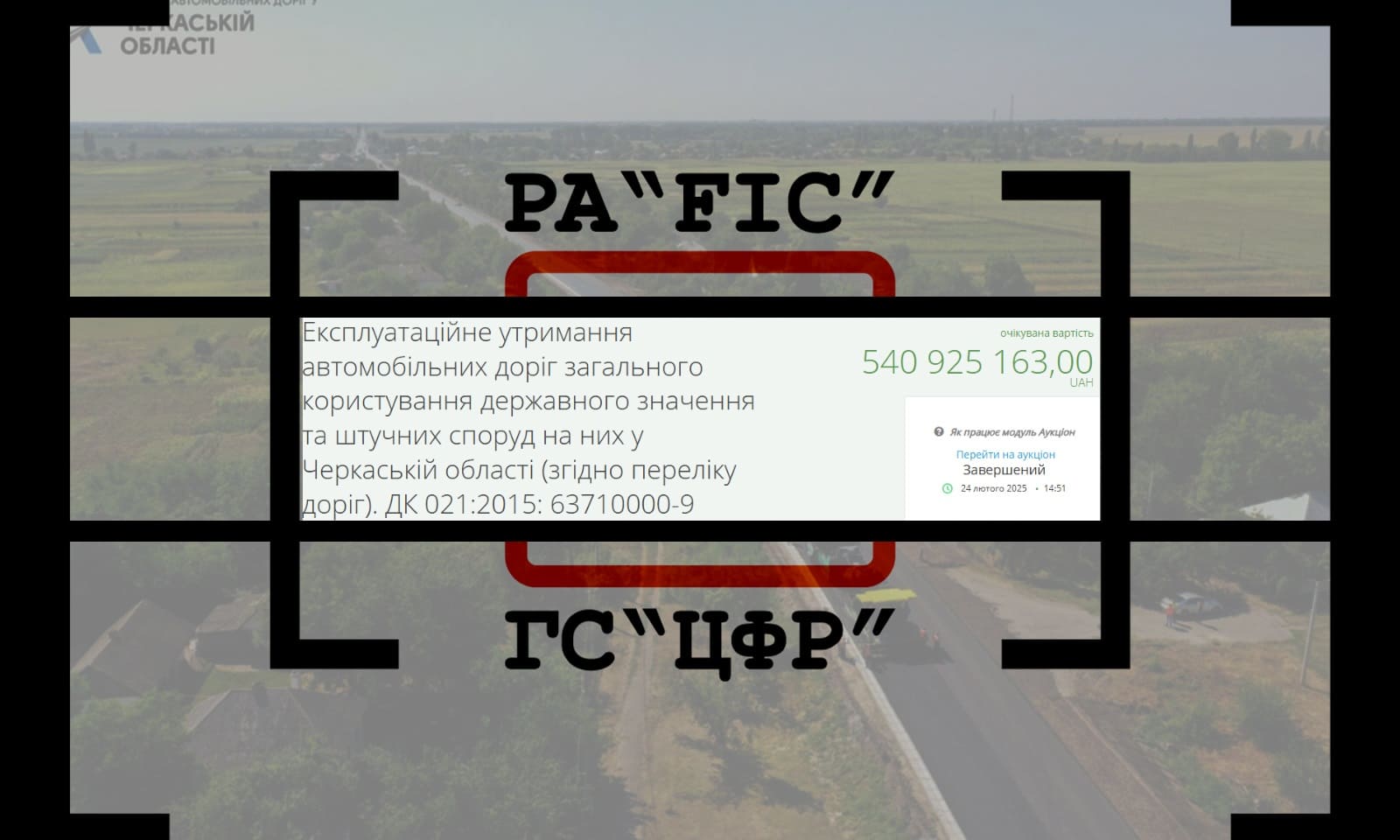 24 лютого Служба відновлення та розвитку інфраструктури у Черкаській області провела три закупівлі на експлуатаційне утримання доріг, загальною очікуваною вартістю у 1 123 597 404 гривні (державний бюджет України).