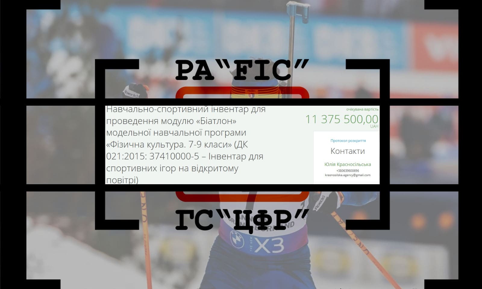 9 жовтня Державна установа “Всеукраїнський центр фізичного здоров’я населення “Агенція учнівського, студентського та масового спорту України” провела закупівлю на навчально-спортивний інвентар для проведення модулю “Біатлон» модельної навчальної програми “Фізична культура. 7-9 класи”. Очікувана вартість закупівлі склала 11 375 500 гривень. Закупівля складалась із двох лотів.