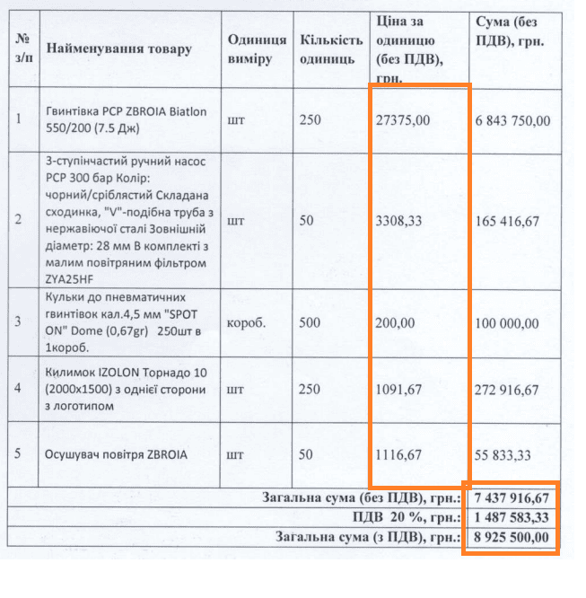 У першому лоті купували гвинтівки РСР, насоси, кулі, каримати, осушувачі для насосів. На торги прийшов один учасник, ТОВ “КОМПАНІЯ ЗБРОЯ” з пропозицією у 8 925 500 гривень.