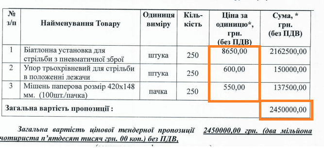 У другому лоті на біатлонні установки, упори та мішені переміг єдиний учасник, ФОП ДЕРКАЧ СЕРГІЙ ВАСИЛЬОВИЧ, з пропозицією у 2 450 000 гривень.