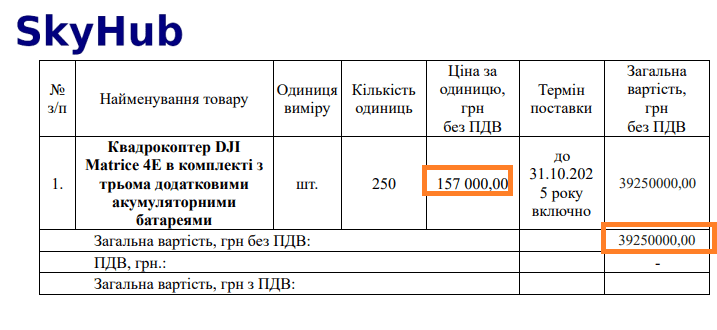 Квадрокоптер DJI Matrice 4Е в комплекті з трьома додатковими акумуляторними батареями вирішили придбати за 40 675 000 гривень. На торгах змагались три учасники, переміг ТОВ “СКАЙХАБ” з пропозицією у 38 843 250 гривень.