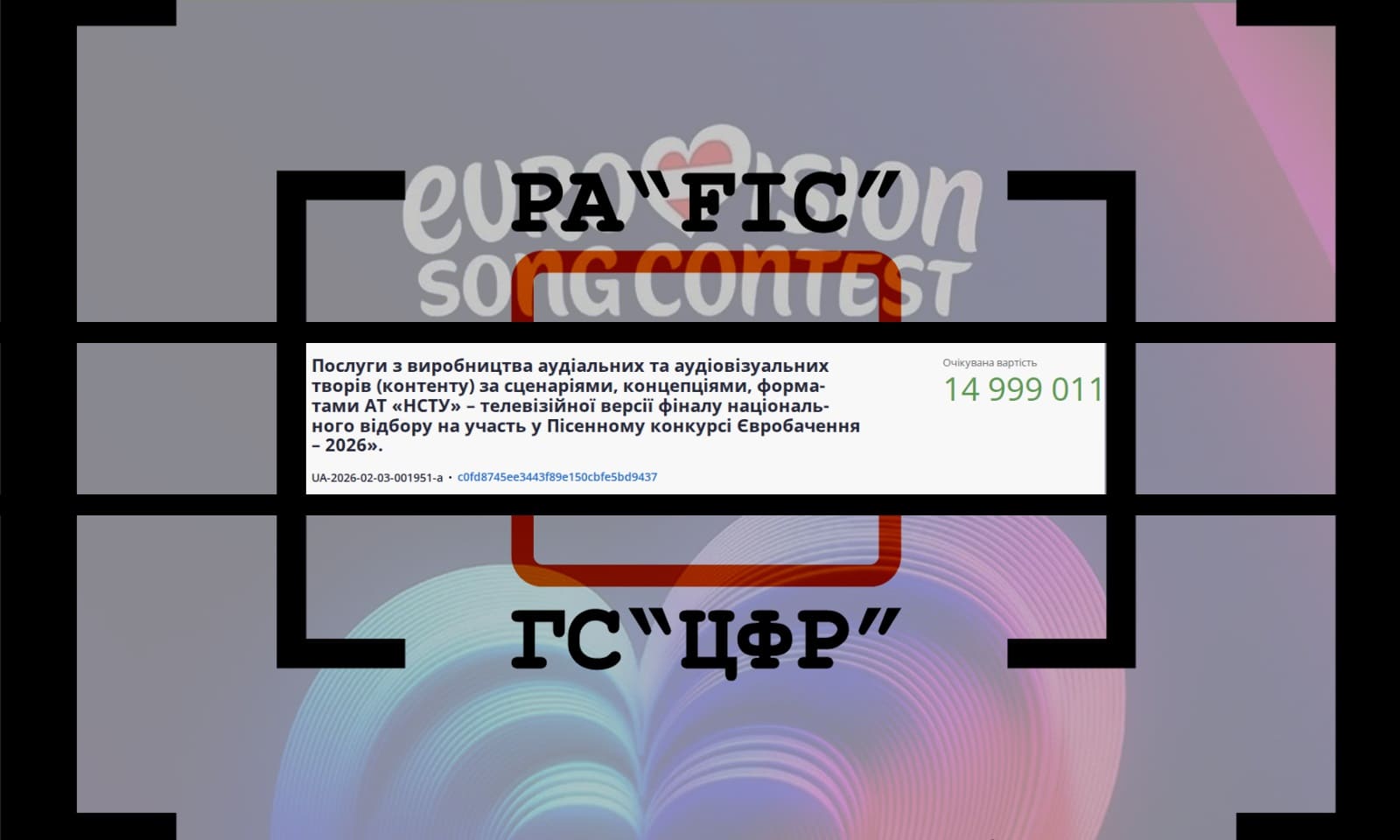 3 лютого АКЦІОНЕРНЕ ТОВАРИСТВО “НАЦІОНАЛЬНА СУСПІЛЬНА ТЕЛЕРАДІОКОМПАНІЯ УКРАЇНИ” провело закупівлю без використання електронної системи на послуги з виробництва аудіальних та аудіовізуальних творів (контенту) за сценаріями, концепціями, форматами АТ “НСТУ” – телевізійної версії фіналу національного відбору на участь у Пісенному конкурсі Євробачення – 2026″.