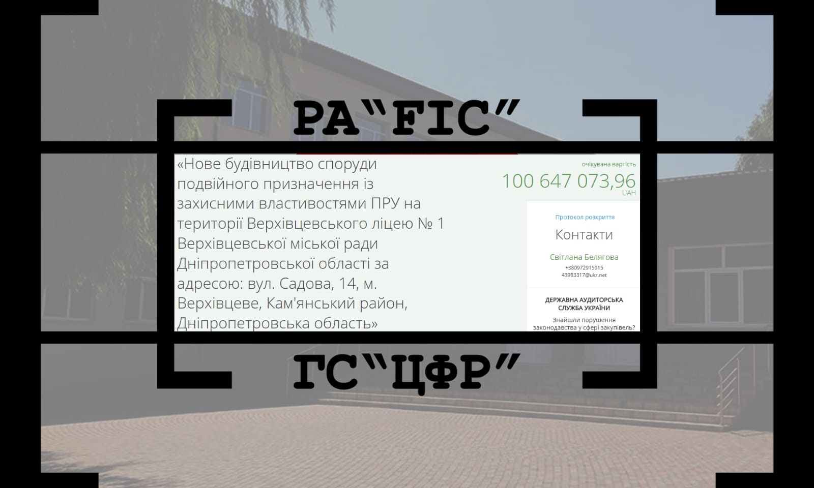 Ще одна закупівля, на реконструкцію підвалу для влаштування споруди подвійного призначення iз захисними властивостями ПРУ будівлі Верхівцевського ліцею № 2, була оцінена у 43 454 187,6 гривні. Джерело фінансування: 5 542 258,8 гривні з місцевого та 37 911 928,8 гривні з державного бюджету. Схоже, ремонт робитимуть за 37 254 650 гривень.
