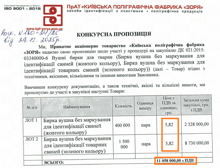 Пропозиції на 400 000 бирок жовтого кольору та 1 500 000 бирок зеленого кольору подали два учасники. В обох лотах переміг ПрАТ Київська поліграфічна фабрика “ЗОРЯ” з пропозиціями у 2 328 000 гривень та 8 730 000 гривень відповідно.