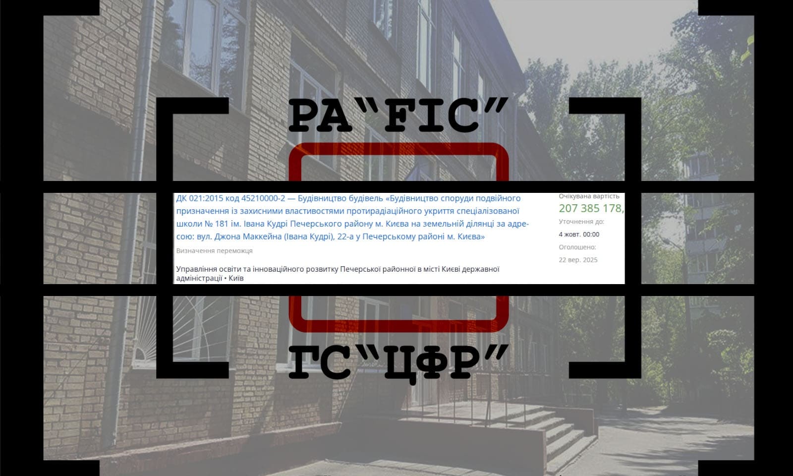 7 жовтня Управління освіти та інноваційного розвитку Печерської районної в місті Києві державної адміністрації провело закупівлю на будівництво споруди подвійного призначення із захисними властивостями протирадіаційного укриття спеціалізованої школи № 181 ім. Івана Кудрі Печерського району м. Києва.
