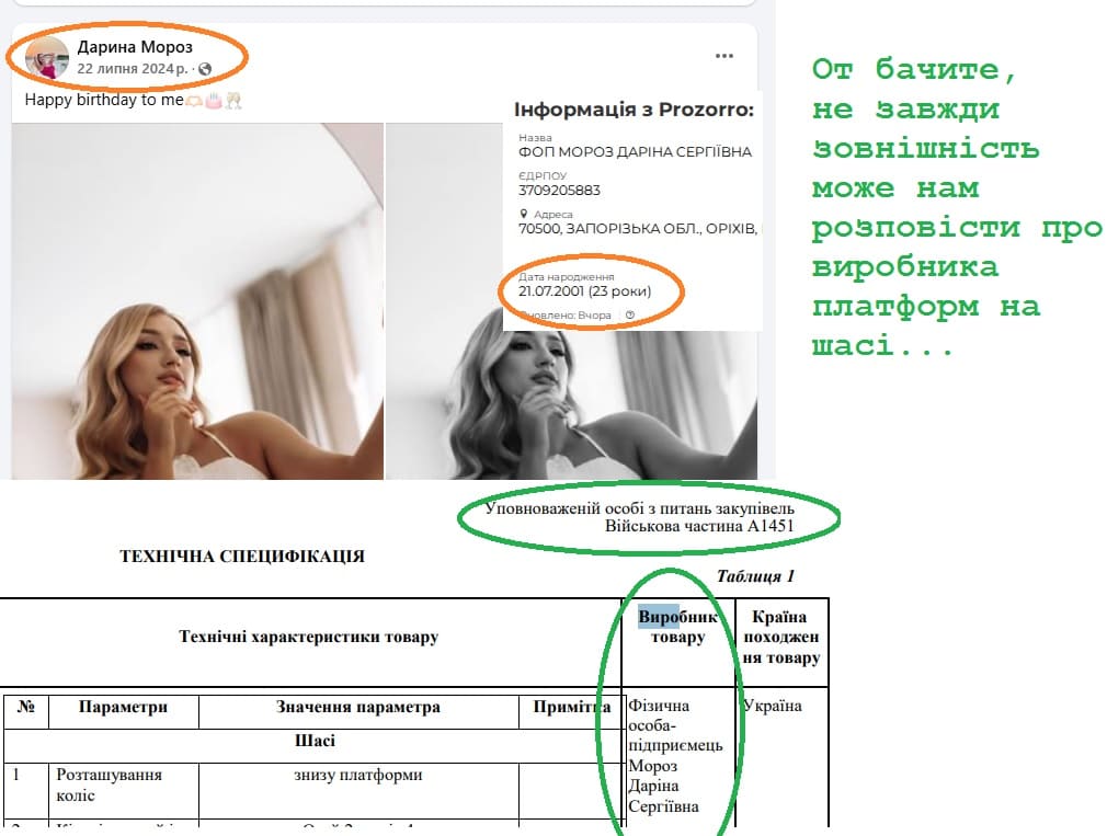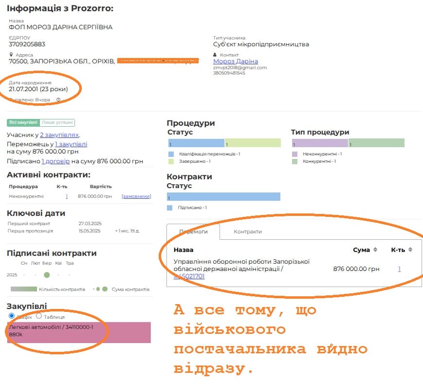 Пані має 23 роки. Це її другий контракт. В березні Управління оборонної роботи Запорізької обласної державної адміністрації придбало у неї 3 всюдиходи Баггі Раптор 1.9 ТД за 876 000 гривень. Чомусь, купили без тендера, впускаючи таким чином пані в широке море тендерів. Закупівлю можете не переглядати, інформації зі сторони учасника там немає. Тому посилання сенсу не додасть.