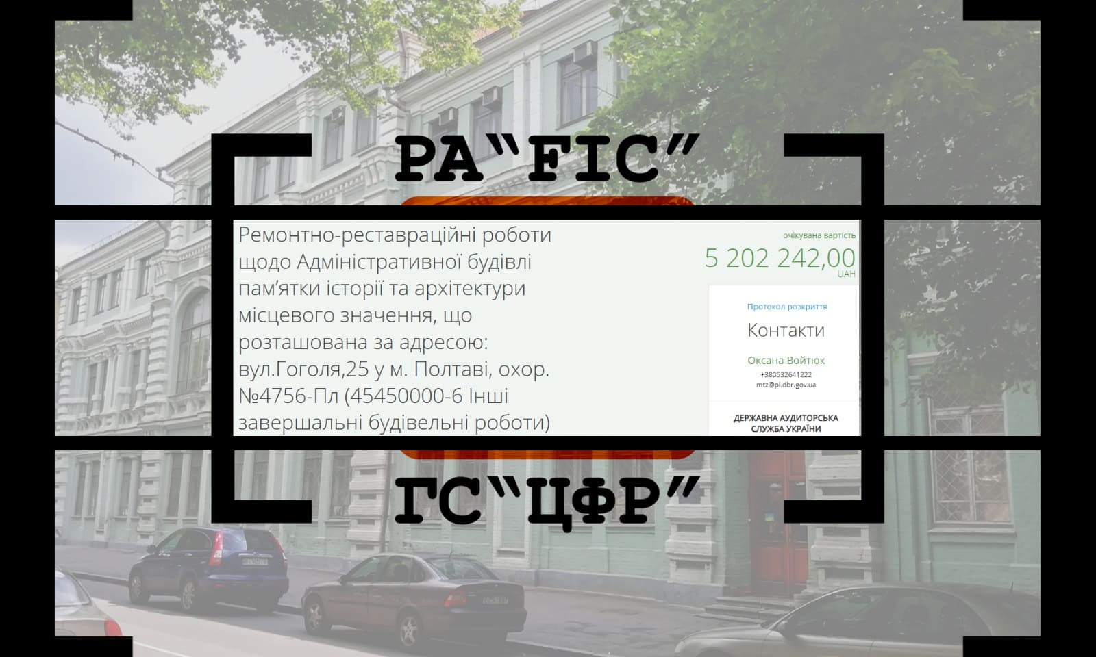 19 листопада ТЕРИТОРІАЛЬНЕ УПРАВЛІННЯ ДЕРЖАВНОГО БЮРО РОЗСЛІДУВАНЬ, РОЗТАШОВАНЕ У МІСТІ ПОЛТАВІ провело закупівлю на ремонтно-реставраційні роботи щодо Адміністративної будівлі пам’ятки історії та архітектури місцевого значення, що розташована за адресою: вул.Гоголя,25 у м. Полтаві, охор. №4756-Пл. Очікувана вартість закупівлі склала 5 202 242 гривні (державний бюджет).