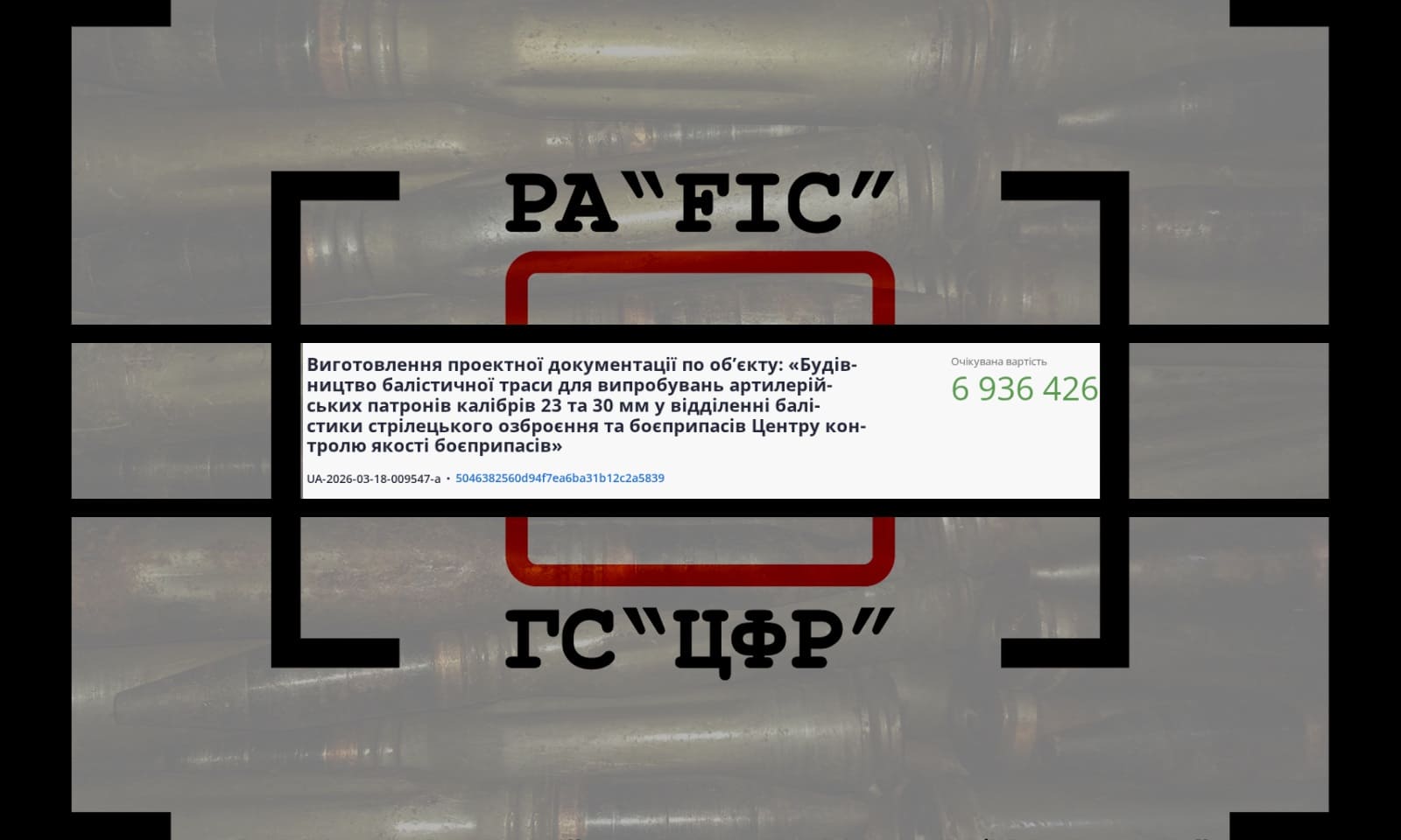1 квітня Військова частина А2192 провела закупівлю на виготовлення проектної документації по об’єкту: “Будівництво балістичної траси для випробувань артилерійських патронів калібрів 23 та 30 мм у відділенні балістики стрілецького озброєння та боєприпасів Центру контролю якості боєприпасів”.