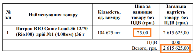 4 вересня ДЕРЖАВНЕ ПІДПРИЄМСТВО МІНІСТЕРСТВА ОБОРОНИ УКРАЇНИ “АГЕНЦІЯ ОБОРОННИХ ЗАКУПІВЕЛЬ” провело закупівлю на патрони до рушниць 12 калібру бюджетом у 27 683 855 гривень. Закупівля складалась із п’яти лотів з розбиванням партій на жовтень, листопад та грудень.