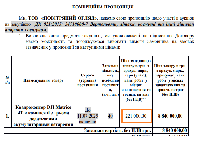 13 червня ДЕРЖАВНА УСТАНОВА “ЦЕНТР АВІАЦІЙНОГО ЗАБЕЗПЕЧЕННЯ НАЦІОНАЛЬНОЇ ПОЛІЦІЇ УКРАЇНИ” провела закупівлю на квадрокоптери DJI Matrice 4Т в комплекті з трьома додатковими акумуляторними батареями. 40 одиниць хочуть отримати за 9 600 000 гривень.