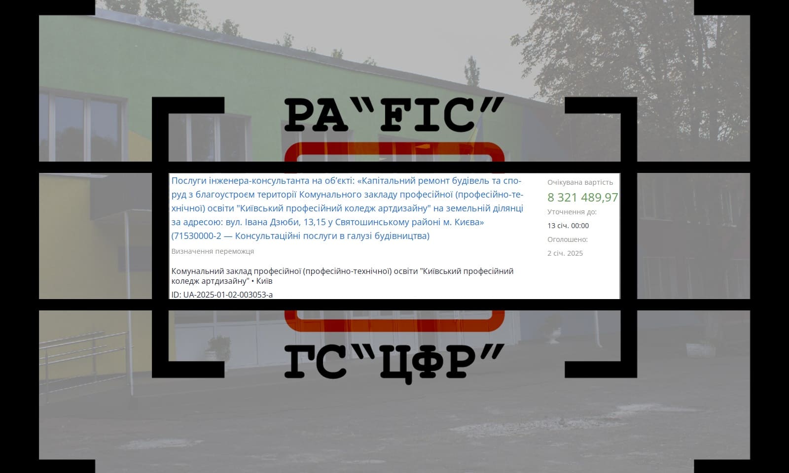 16 січня Комунальний заклад професійної (професійно-технічної) освіти “Київський професійний коледж артдизайну” провів закупівлю на послуги інженера-консультанта на об’єкті: “Капітальний ремонт будівель та споруд з благоустроєм території Комунального закладу професійної (професійно-технічної) освіти “Київський професійний коледж артдизайну” на земельній ділянці за адресою: вул. Iвана Дзюби, 13,15 у Святошинському районі м. Києва”.