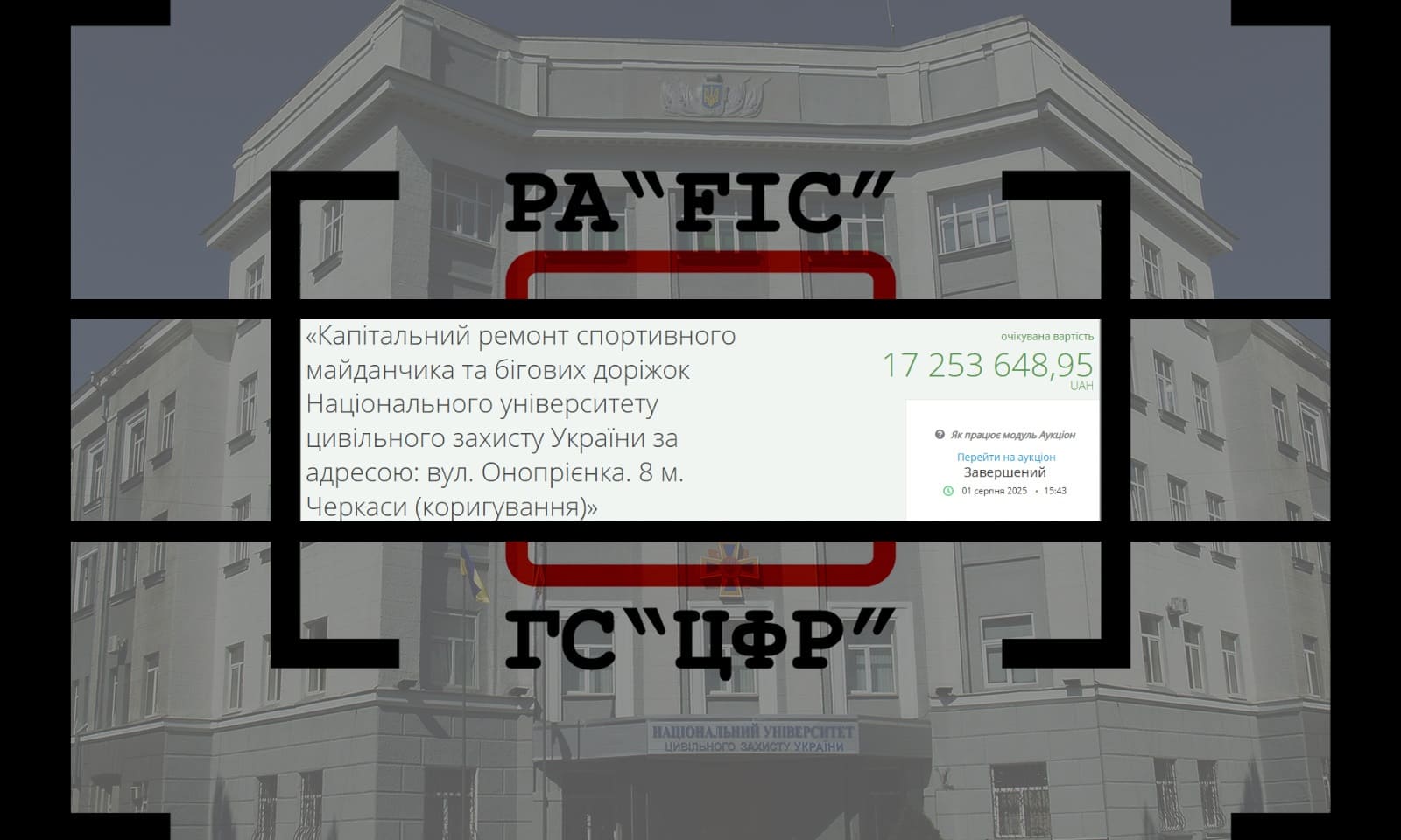 1 серпня НАЦІОНАЛЬНИЙ УНІВЕРСИТЕТ ЦИВІЛЬНОГО ЗАХИСТУ УКРАЇНИ провів закупівлю на капітальний ремонт спортивного майданчика та бігових доріжок Національного університету цивільного захисту України за адресою: вул. Онопрієнка. 8 м. Черкаси (коригування).