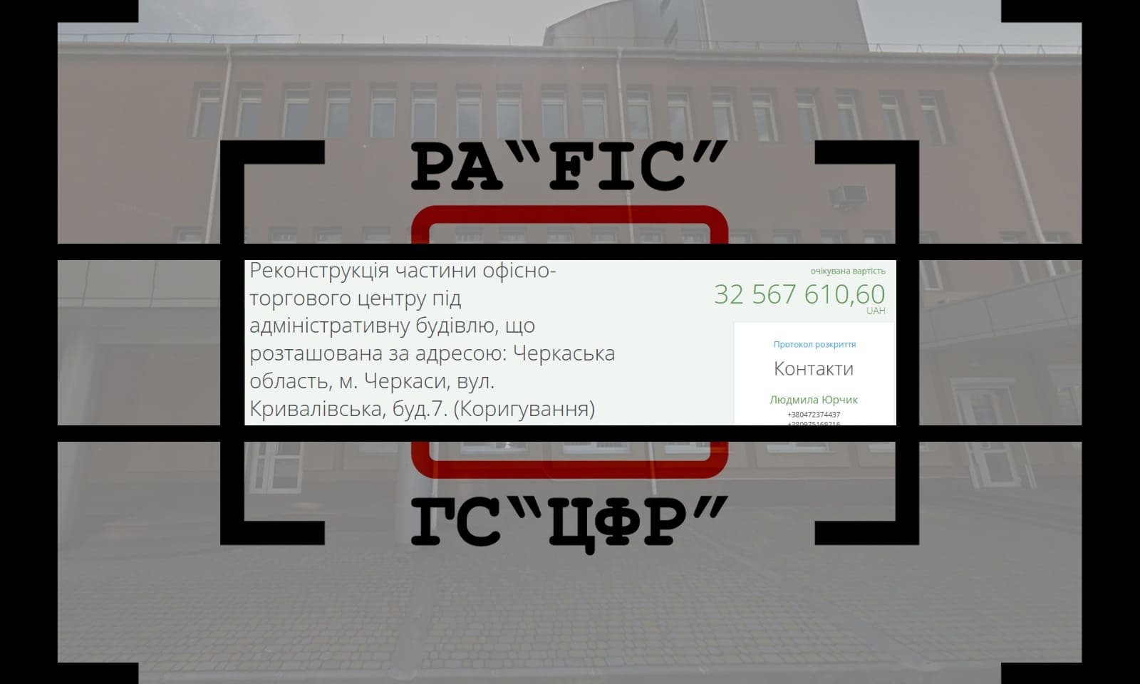 1 вересня ГОЛОВНЕ УПРАВЛІННЯ ДЕРЖПРОДСПОЖИВСЛУЖБИ В ЧЕРКАСЬКІЙ ОБЛАСТІ провело закупівлю на реконструкцію частини офісно-торгового центру під адміністративну будівлю, що розташована за адресою: Черкаська область, м. Черкаси, вул. Кривалівська, буд.7. (Коригування).