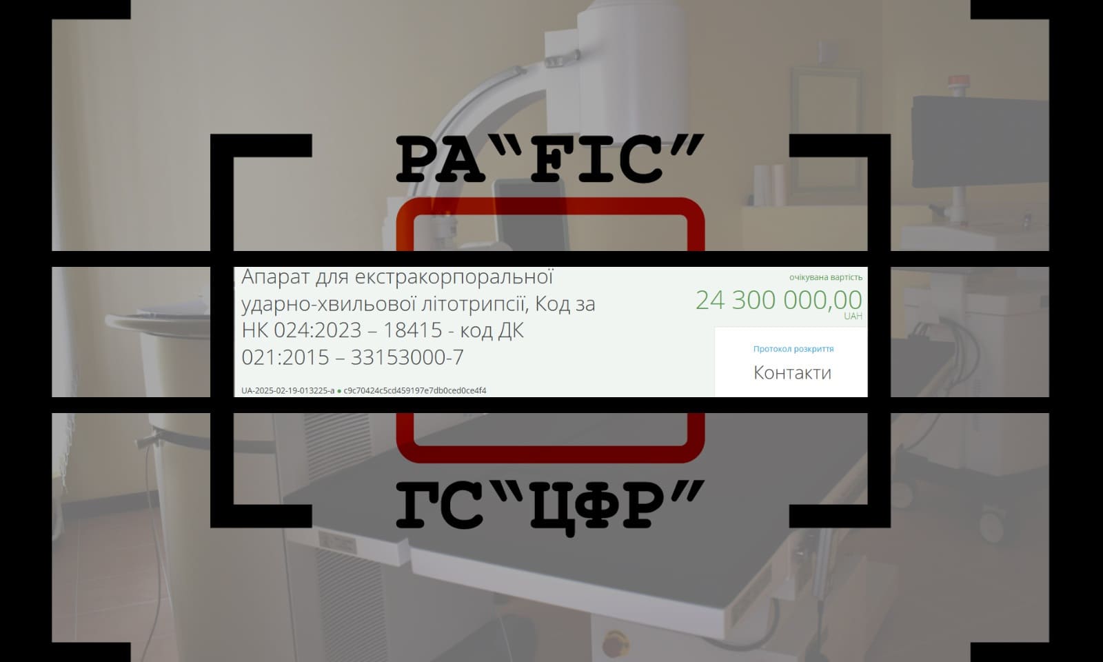 27 лютого КОМУНАЛЬНЕ НЕКОМЕРЦІЙНЕ ПІДПРИЄМСТВО “ТРЕТЯ ЧЕРКАСЬКА МІСЬКА ЛІКАРНЯ ШВИДКОЇ МЕДИЧНОЇ ДОПОМОГИ” провело закупівлю апарату для екстракорпоральної ударно-хвильової літотрипсії, очікуваною вартістю 24 300 000 гривень (кошти місцевого бюджету).