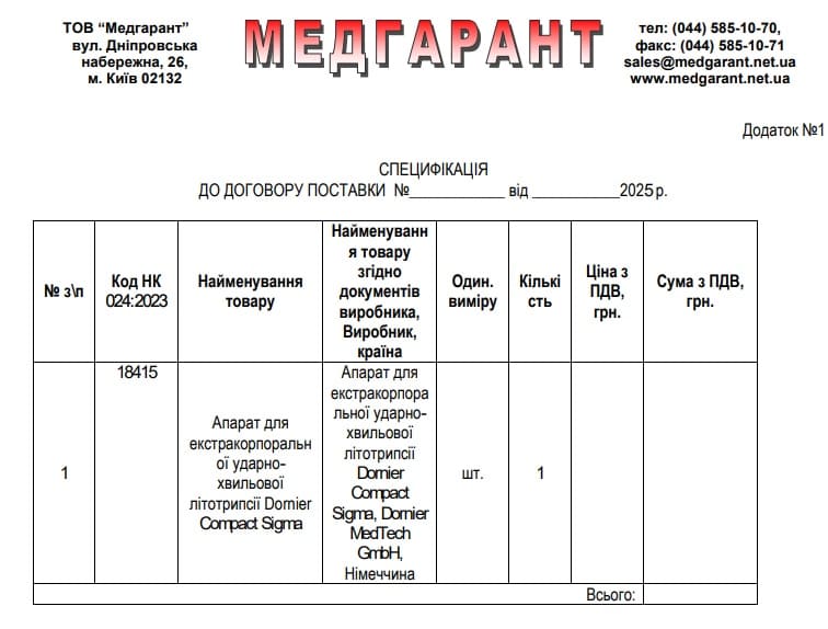 ТОВ пропонує модель “Апарат для екстракорпоральної ударно-хвильової лiтотрипсiї Dornier Compact Sigma” (Німеччина).
