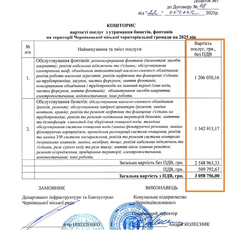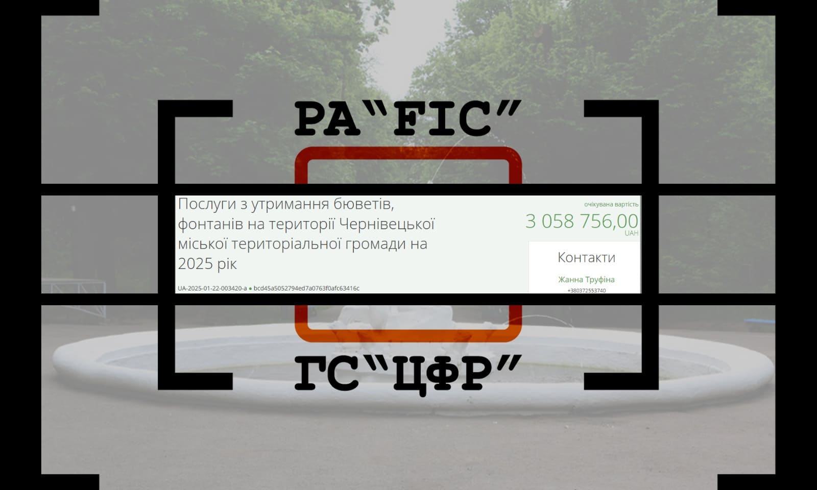 22 січня ДЕПАРТАМЕНТ ІНФРАСТРУКТУРИ ТА БЛАГОУСТРОЮ ЧЕРНІВЕЦЬКОЇ МІСЬКОЇ РАДИ провів торги без тендера на послуги з утримання бюветів, фонтанів на території Чернівецької міської територіальної громади на 2025 рік. Вартість закупівлі склала 3 058 756 гривень.