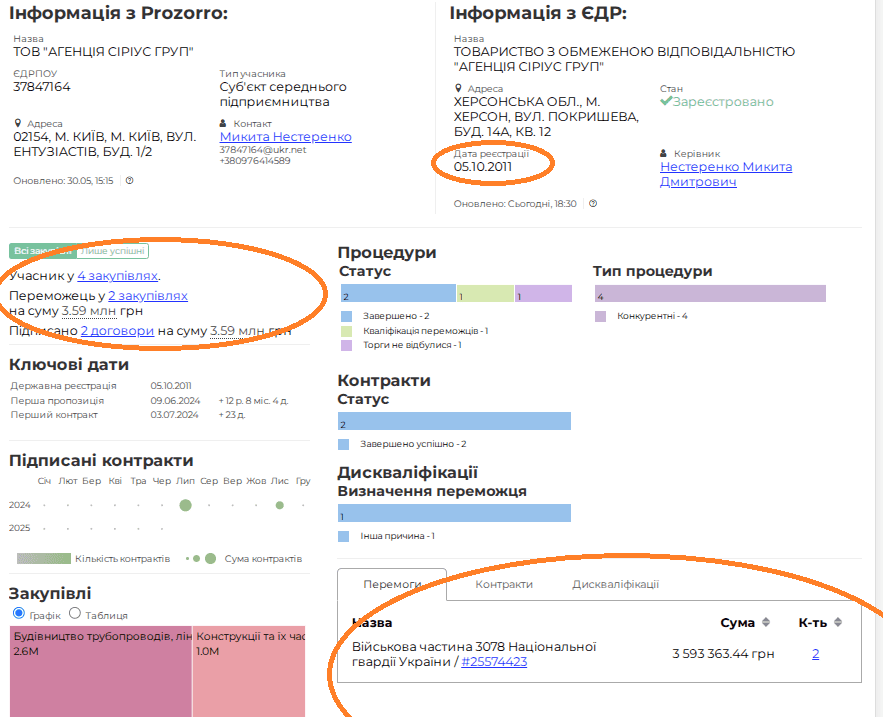 ТОВ існує з 2011 року. Досі мав два контракти на 3 мільйони гривень. Обидва – з Військовою частиною 3078 Національної гвардії України у липні та листопаді 2024 року.