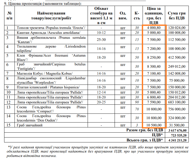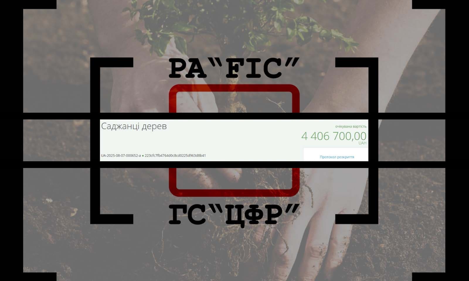 15 серпня Комунальне підприємство по утриманню зелених насаджень Дарницького району м. Києва провело закупівлю на саджанці дерев, очікуваною вартістю у 4 406 700 гривень.