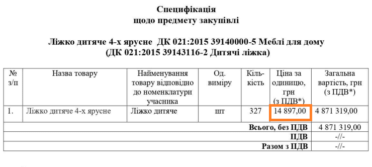 24 вересня КОМУНАЛЬНЕ ПІДПРИЄМСТВО “ЦЕНТРАЛІЗОВАНА ЗАКУПІВЕЛЬНА ОРГАНІЗАЦІЯ” ДНІПРОВСЬКОЇ МІСЬКОЇ РАДИ провело закупівлю ліжок дитячих 4-ярусних. Очікувана вартість 327 одиниць склала 4 871 319 гривень.