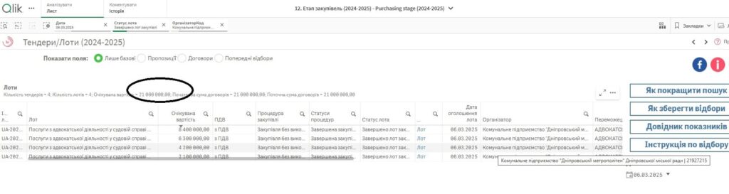 6 березня Комунальне підприємство “Дніпровський метрополітен” Дніпровської міської ради провело закупівлю без відкритих торгів на послуги з адвокатської діяльності вартістю у 21 000 000 гривень.