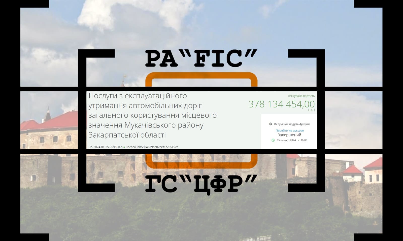 5 лютого ДЕРЖАВНЕ ПІДПРИЄМСТВО “СЛУЖБА МІСЦЕВИХ АВТОМОБІЛЬНИХ ДОРІГ У ЗАКАРПАТСЬКІЙ ОБЛАСТІ” провело торги на послуги з експлуатаційного утримання автомобільних доріг загального користування місцевого значення Мукачівського району Закарпатської області бюджетом у 378 134 454 гривні (100% місцевий бюджет).