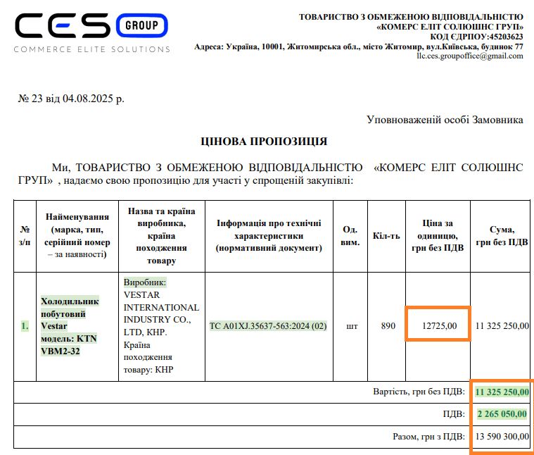 На поставку холодильників очікують до 1 листопада 2025 року.