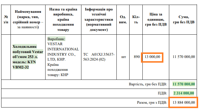16 вересня Державне підприємство Міністерства оборони України “Державний оператор тилу” провело закупівлю на холодильники побутові об’ємом 250-299 л. Очікувана вартість 890 одиниць склала 14 060 220 гривень.