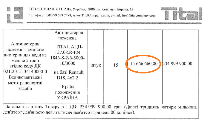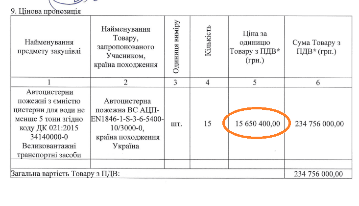16 травня Управління забезпечення Оперативно-рятувальної служби цивільного захисту Державної служби України з надзвичайних ситуацій провело закупівлю трьома лотами на автоцистерни пожежні з ємністю цистерни для води не менше 5 тонн. Очікувана вартість закупівлі склала 657 999 999,72 гривні.