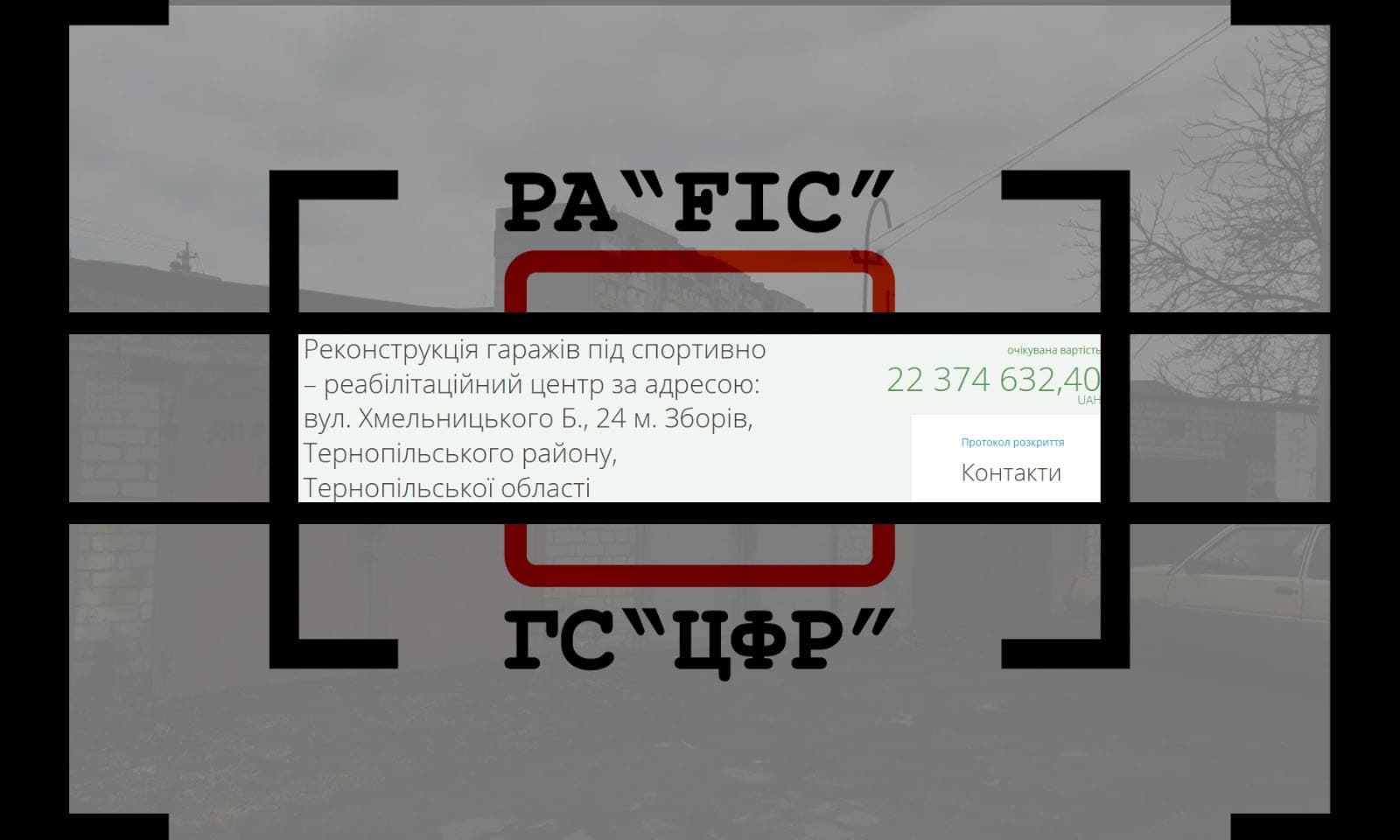 29 квітня КОМУНАЛЬНА УСТАНОВА “ЦЕНТР НАДАННЯ СОЦІАЛЬНИХ ПОСЛУГ” ЗБОРІВСЬКОЇ МІСЬКОЇ РАДИ провела закупівлю на реконструкцію гаражів під спортивно – реабілітаційний центр за адресою: вул. Хмельницького Б., 24 м. Зборів, Тернопільського району, Тернопільської області. Очікувана вартість закупівлі склала 22 374 632,4 гривні (місцевий бюджет).