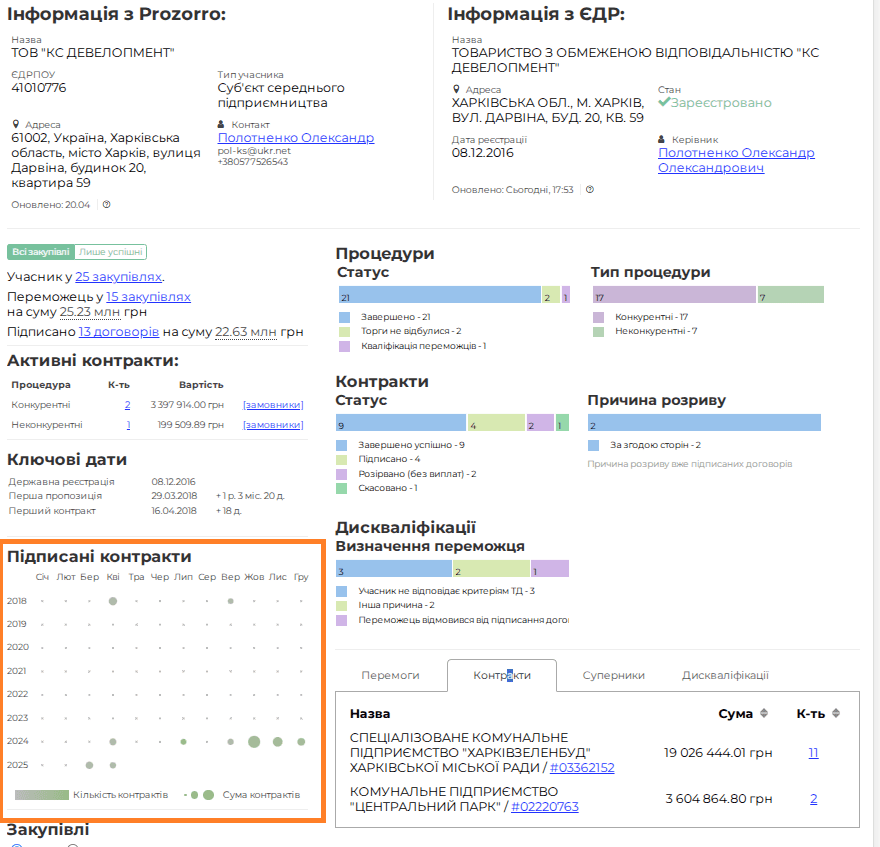 ТОВ існує з 2016 року. Має 13 договорів на 22 мільйони гривень. Мав досить велику перерву між контрактами: з вересня 2018 року по квітень 2024 року. Співпрацює лише з двома замовниками в Харкові.
