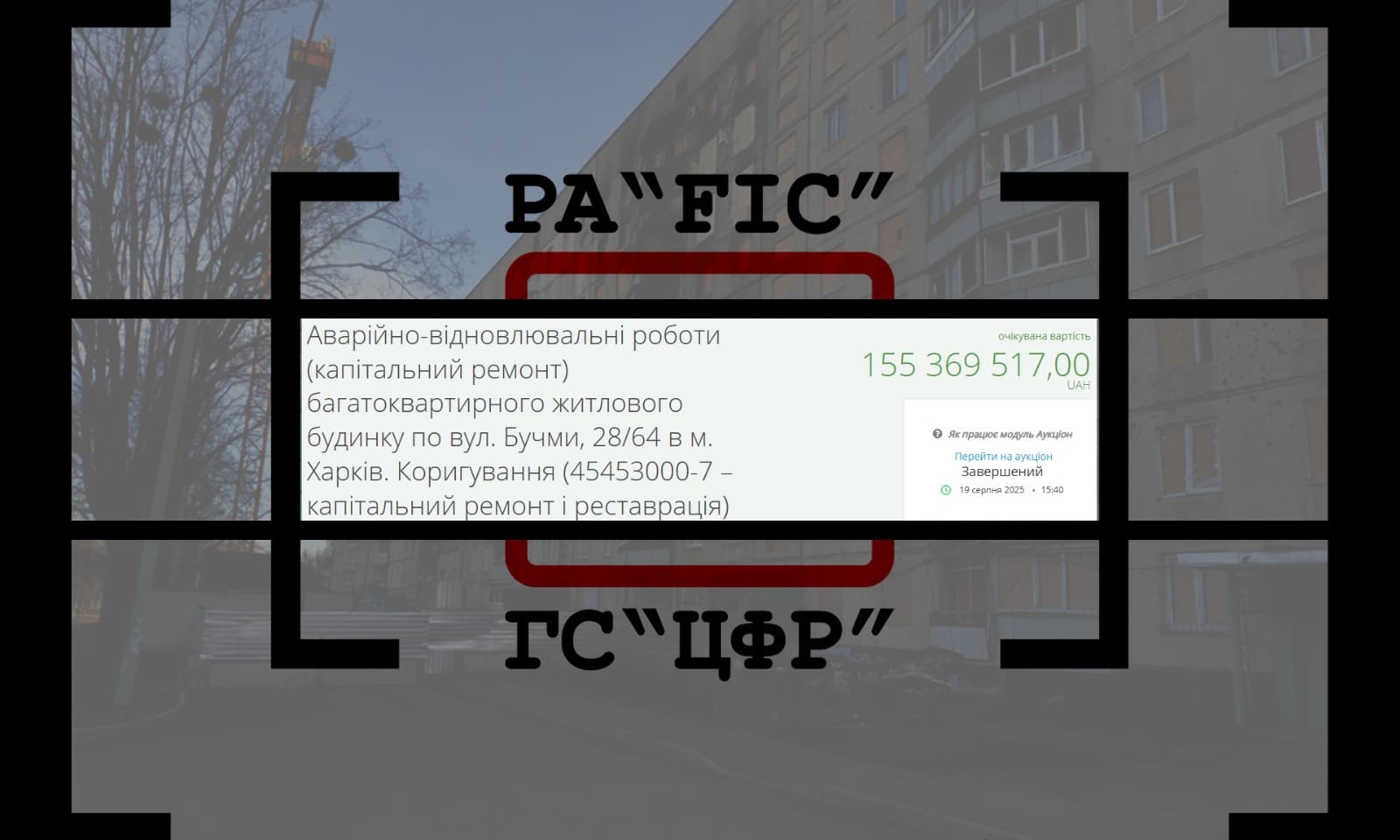 19 серпня ДЕПАРТАМЕНТ З БЛАГОУСТРОЮ, ВІДБУДОВИ ТА РЕКОНСТРУКЦІЇ ХАРКІВСЬКОЇ МІСЬКОЇ РАДИ провів закупівлю на капітальний ремонт багатоквартирного житлового будинку по вул. Бучми, 28/64 в м. Харків. Коригування. Очікувана вартість закупівлі склала 155 369 517 гривень.