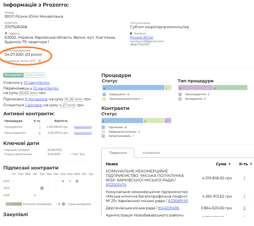ФОП зареєстрований в липні 2023 року. Власниці ФОП – 23 роки. Має 9 договорів на 16 мільйонів гривень.