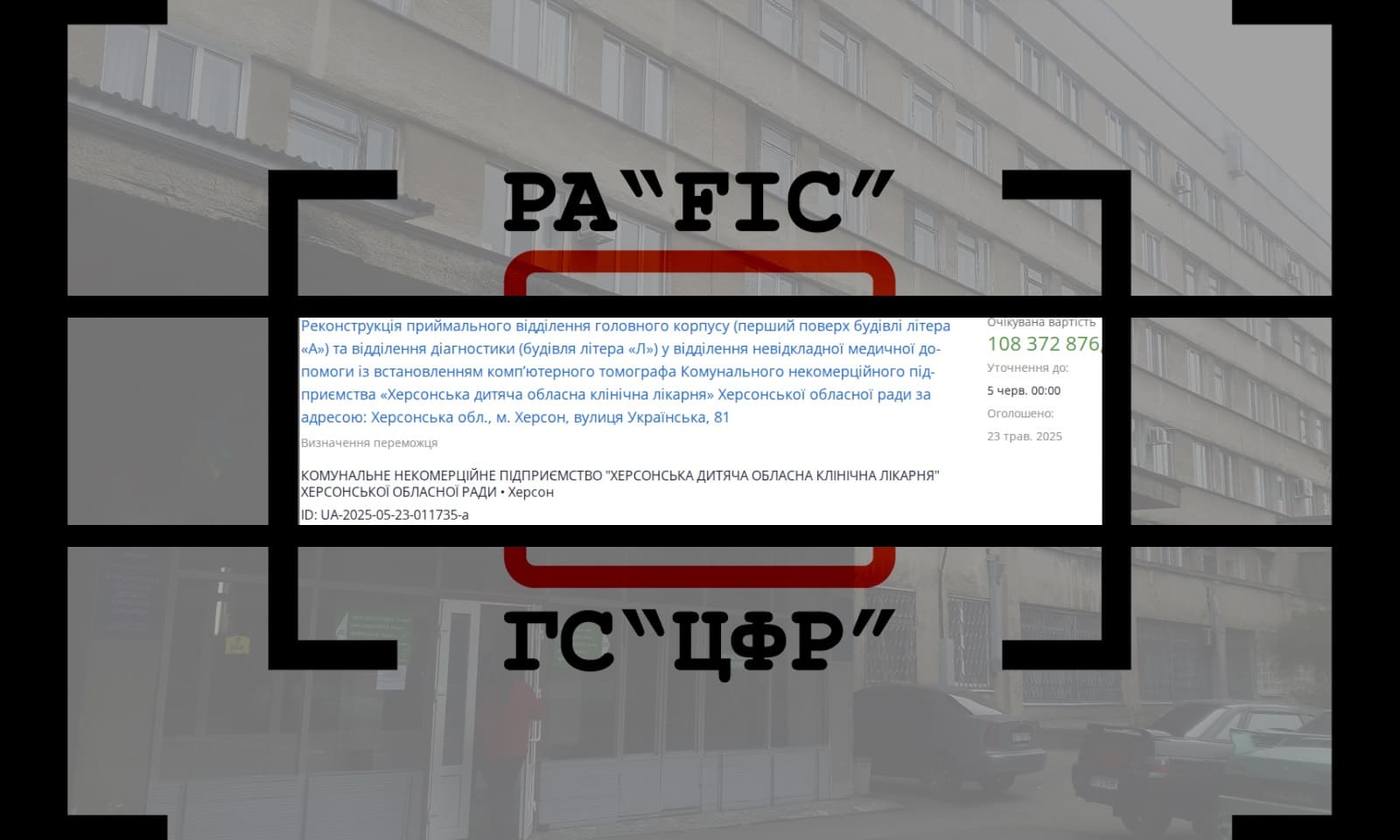 9 червня КОМУНАЛЬНЕ НЕКОМЕРЦІЙНЕ ПІДПРИЄМСТВО “ХЕРСОНСЬКА ДИТЯЧА ОБЛАСНА КЛІНІЧНА ЛІКАРНЯ” ХЕРСОНСЬКОЇ ОБЛАСНОЇ РАДИ провело закупівлю на реконструкцію приймального відділення головного корпусу (перший поверх будівлі літера “А”) та відділення діагностики (будівля літера “Л”) у відділення невідкладної медичної допомоги із встановленням комп’ютерного томографа лікарні.
