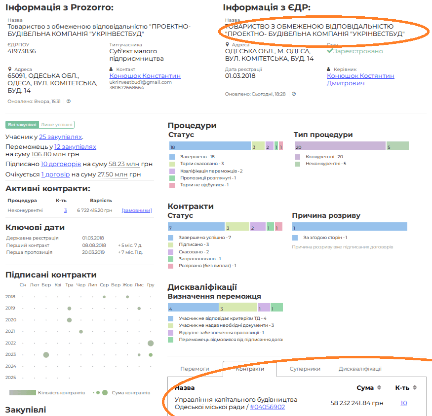 ТОВ існує з 2018 року, має 10 договорів на 58 мільйонів гривень. Раніше працював виключно з одним замовником: Управлінням капітального будівництва Одеської міської ради.