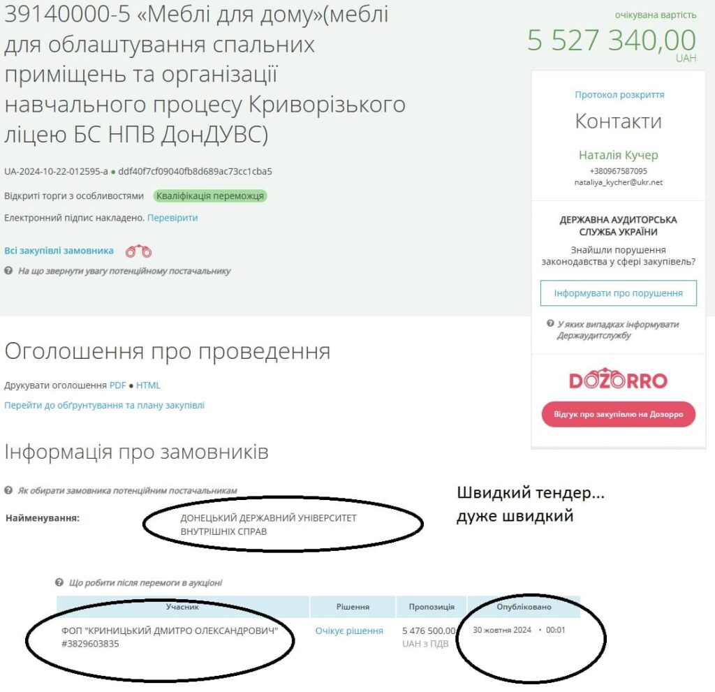 30 жовтня. ДОНЕЦЬКИЙ ДЕРЖАВНИЙ УНІВЕРСИТЕТ ВНУТРІШНІХ СПРАВ, який переїхав до Кропивницького, проводить тендер на “меблі для дому”. Точніше сказати “меблі для облаштування спальних приміщень та організації навчального процесу Криворізького ліцею БС НПВ ДонДУВС”.