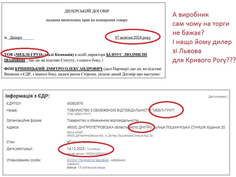 Пан Дмитро пропонує меблі ТОВу “МЕБЛІ-ГРУП”, створеної 10 місяців тому. Чомусь своїми ногами ця ТОВка на торги сама йти не захотіла. То що тепер виходить: Львівський ФОП везтиме дніпровські меблі в Кривий Ріг. Чи не здається вам, що ФОП у цій схемі лишній?…