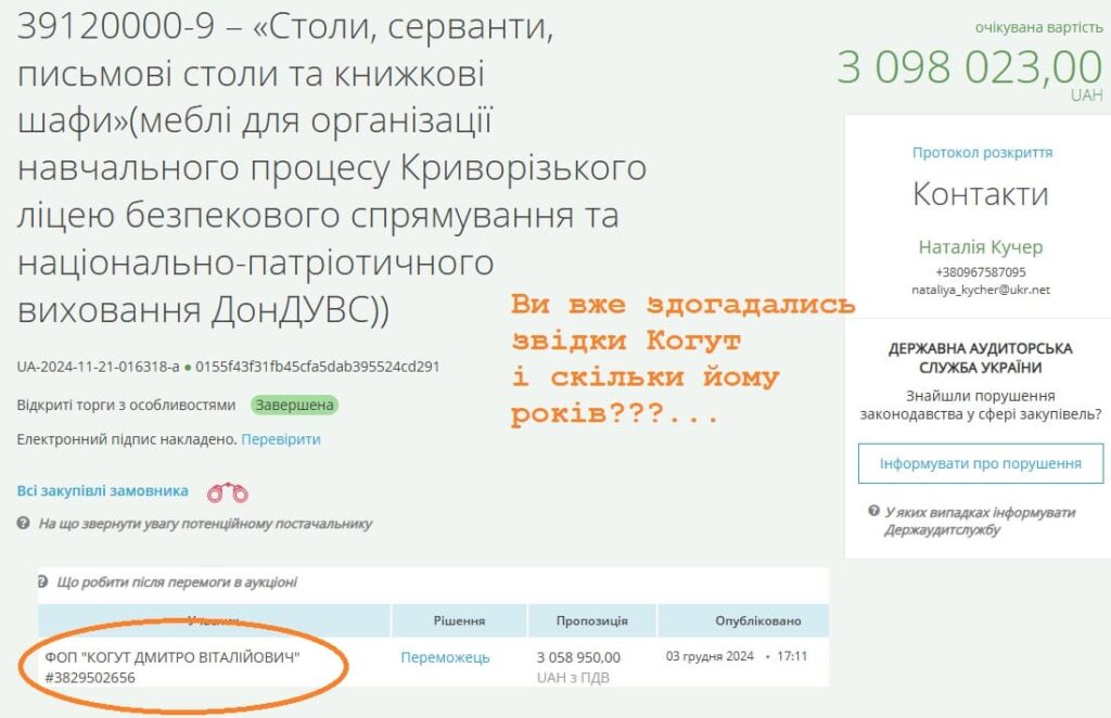 Третього грудня відбувся ще один тендер цього замовника на меблі, бюджетом у 3 098 023 гривні. На торгах переміг ФОП “КОГУТ ДМИТРО ВІТАЛІЙОВИЧ” з пропозицією у 3 058 950 гривень.