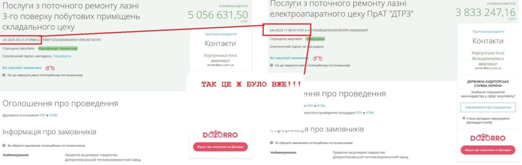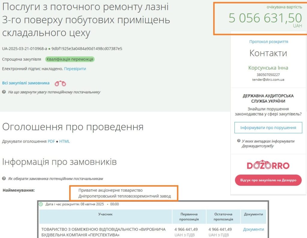 Послуги з поточного ремонту лазні 3-го поверху побутових приміщень складального цеху розтендерили 8 квітня. На фіналі, сума склала 4 966 441,49 гривні.