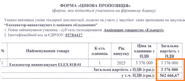 На торгах переміг єдиний учасник, АТ “ЕЛЬВОРТІ”, з пропозицією, яка не відрізняється від очікуваної вартості.
