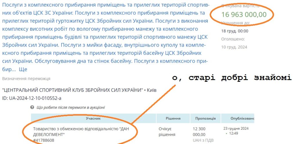 23 грудня “ЦЕНТРАЛЬНИЙ СПОРТИВНИЙ КЛУБ ЗБРОЙНИХ СИЛ УКРАЇНИ” замовив послуг з прибирання об’єктів аж на 16 963 000 гривень. На торги прийшли три учасники. Переміг ТОВ “ДАН ДЕВЕЛОПМЕНТ” з пропозицією у 12 300 000 гривень. І ми їх досить добре знаємо.