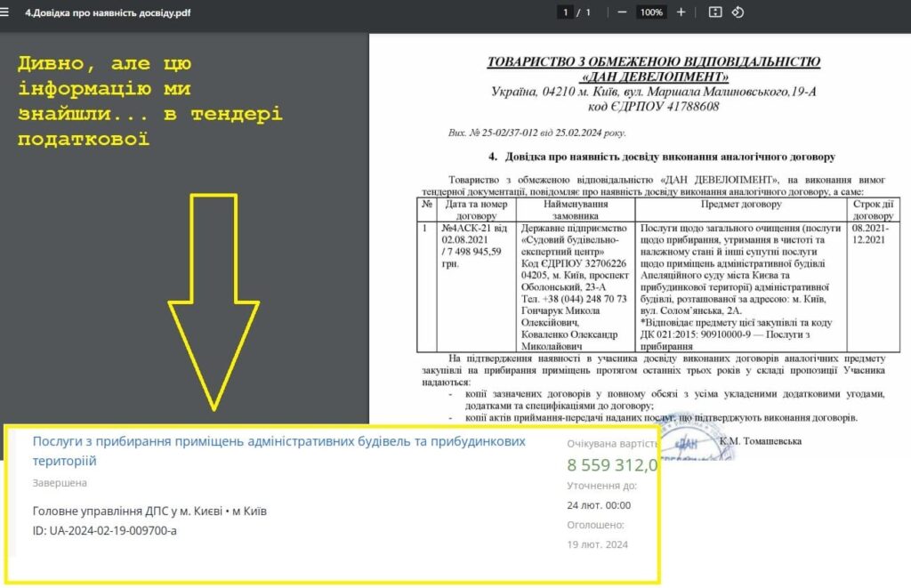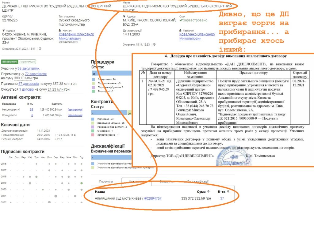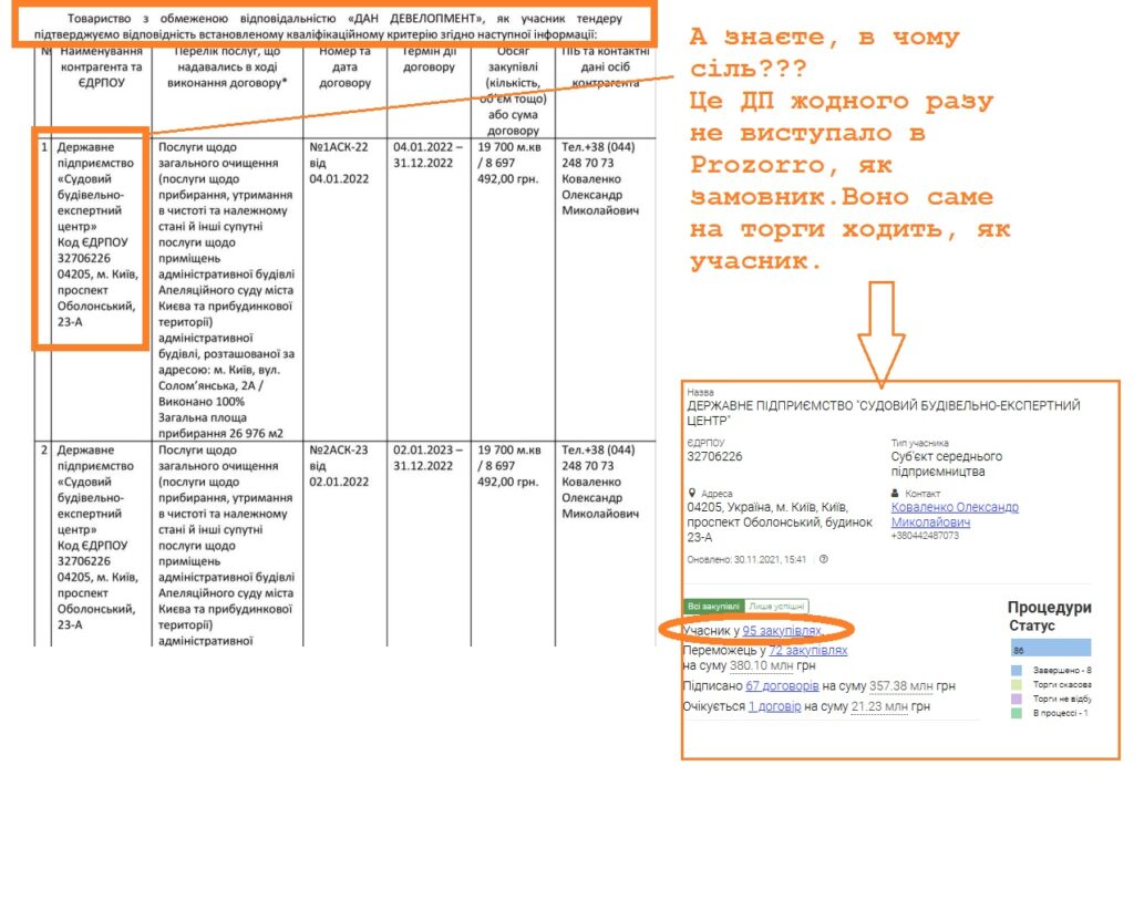 Невідомо чому, але досвід прибирання в НСТУ “ДАН” не використовує в інших тендерах. Наприклад, у нашому випадку з прибиранням спортивного клубу, додають два контракти прибирання в ДП “Судовий будівельно-експертний центр” за 2022 та 2023 рік. Хочете посміятись? Цих двох закупівель у Prozorro немає! ТОБТО: “ДАН” міг додати підтвердження своїх реальних досвідів з тою ж НСТУ, але дав той досвід з ДП, якого, може й не було в реалі.