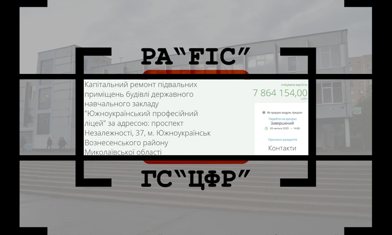 3 лютого ДЕПАРТАМЕНТ МІСТОБУДУВАННЯ, АРХІТЕКТУРИ, КАПІТАЛЬНОГО БУДІВНИЦТВА ТА СУПРОВОДЖЕННЯ ПРОЄКТІВ РОЗВИТКУ МИКОЛАЇВСЬКОЇ ОБЛАСНОЇ ДЕРЖАВНОЇ АДМІНІСТРАЦІЇ провів закупівлю на капітальний ремонт підвальних приміщень будівлі державного навчального закладу “Южноукраїнський професійний ліцей”. Очікувана вартість склала 7 864 154 гривні (державний бюджет).