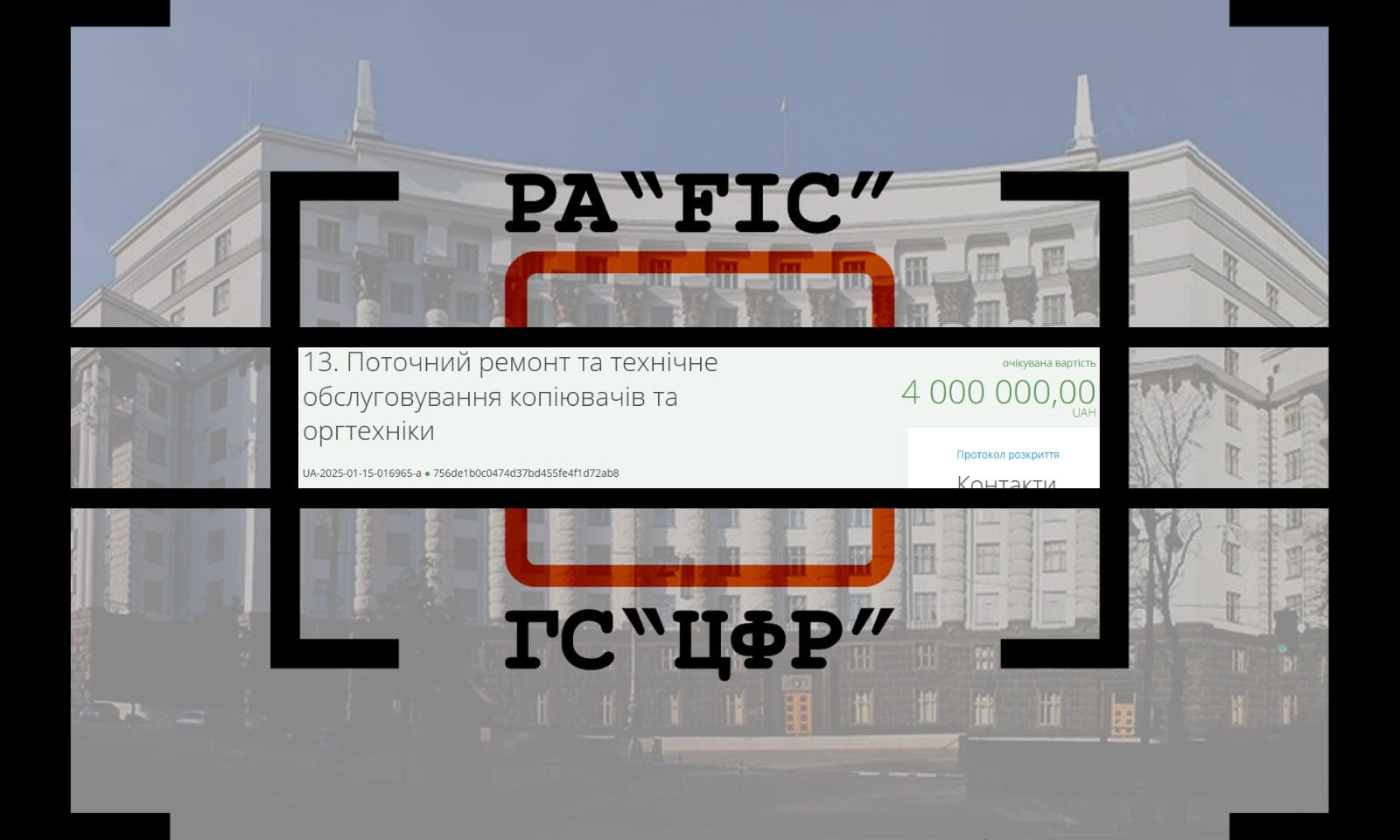 23 січня Господарсько-фінансовий департамент Секретаріату Кабінету Міністрів України провів закупівлю на поточний ремонт та технічне обслуговування копіювачів та оргтехніки. Очікувана вартість закупівлі склала 4 000 000 гривень.