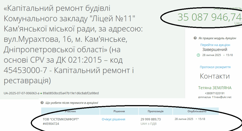 Торги на ремонт ліцею №11 за 35 мільйонів гривень (місцеві кошти), відбулись 28 липня. На них прийшли уже нам відомий “Афінацентр” (має досвід і проєкти) і оте, інше, ТОВ “СІСТЕМКОМФОРТ”. Останній учасник і переміг з пропозицією у 29 999 889,73 гривні.