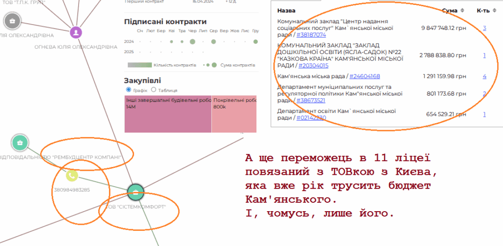 Але давайте ще трохи про Кам’янське. Оцей переможець в 11-му ліцеї пов’язаний номером телефону з ТОВом “РЕМБУДЦЕНТР КОМПАНІ”. Ця компанія з’явилась в лютому 2024-го, знаходиться в Києві. Вже має 11 договорів… виключно в Кам’янському.