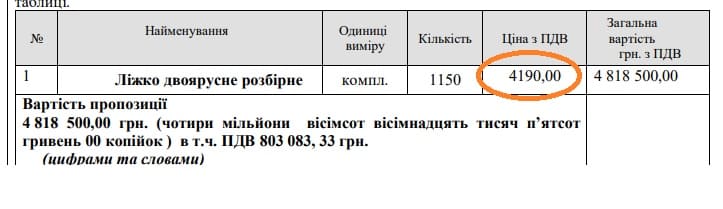 17 травня Квартирно-експлуатаційний відділ м. Чернігів провів закупівлю на ліжка двоярусні розбірні. Очікувана вартість 1150 комплектів склала 5 000 000 гривень.