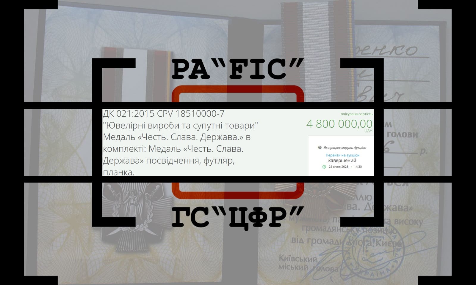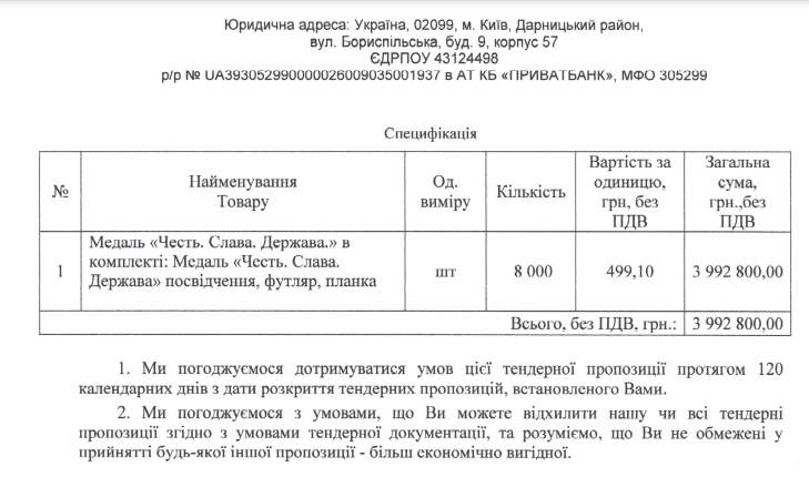 23 січня Апарат виконавчого органу Київської міської ради (Київської міської державної адміністрації) провів закупівлю на ювелірні вироби та супутні товари” Медаль “Честь. Слава. Держава.” в комплекті: Медаль “Честь. Слава. Держава” посвідчення, футляр, планка. Очікувана вартість закупівлі склала 4 800 000 гривень.