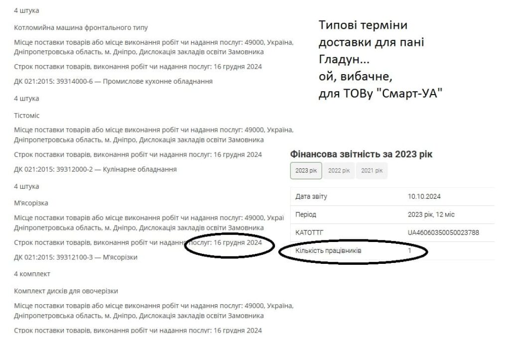 1. 1,6 мільйона від КЗО “Криворізька спеціальна школа “Натхнення” Дніпропетровської обласної ради”. 26 предметів з доставкою до 30 листопада. А тут і овочерізки і стелажі і холодильники.